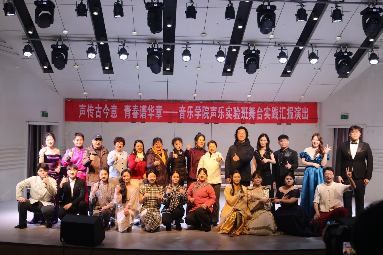2026年1月6日下午,音乐学院音乐厅内歌声悠扬、掌声阵阵,“声传古今意,青春谱华章——音乐学院声乐实验班舞台实践汇报演出”在此精彩上演。学院领导班子成员、声乐教研室教师与广大学生齐聚一堂,共同品鉴这场兼具专业水准与文化底蕴的汇报演出。作为学院深化音乐教育改革、推进声乐课程思政建设的重要实践平台,声乐实验班以挖掘和培育高素质声乐专业人才为核心目标,围绕演唱技巧打磨、作品艺术处理、舞台表现力塑造以及音...